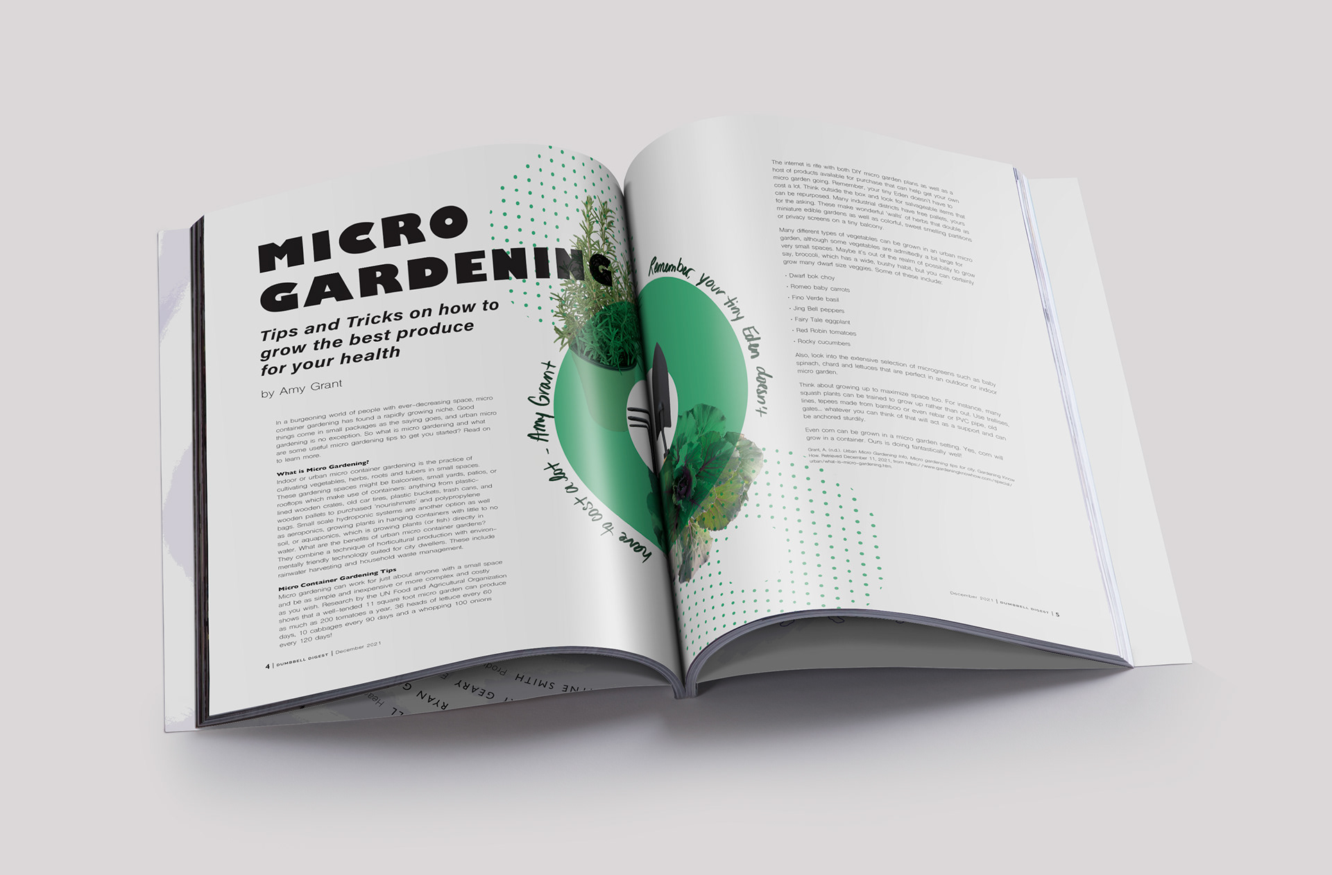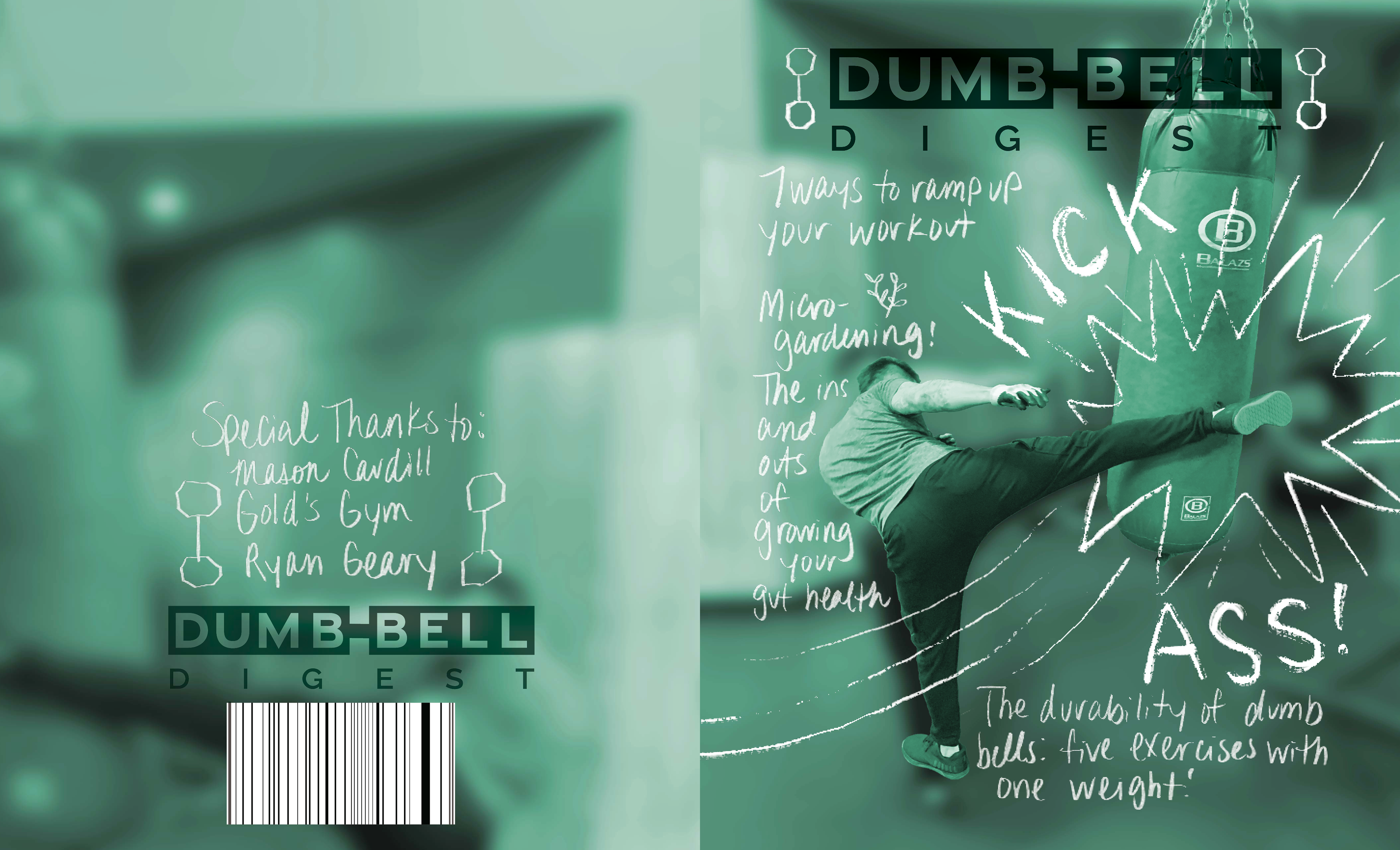 Dumbbell Digest is a proposal for a magazine emphasizing fitness and gardening. The included articles lend readers tips on how to garden while living in a city and the proper way to lift weights. The mixture of hand drawn and digital type create an approachable and trustworthy environment for readers to learn in. I chose to create a logo that resembles a dumbbell for a fun and easily recognizable masthead. I also chose to incorporate hand-drawn elements to connect with readers on an earthy, tactile and tangible level. This magazine also allowed me to further curate my typesetting abilities by creating articles that are easy to read and folios that are easy to navigate.