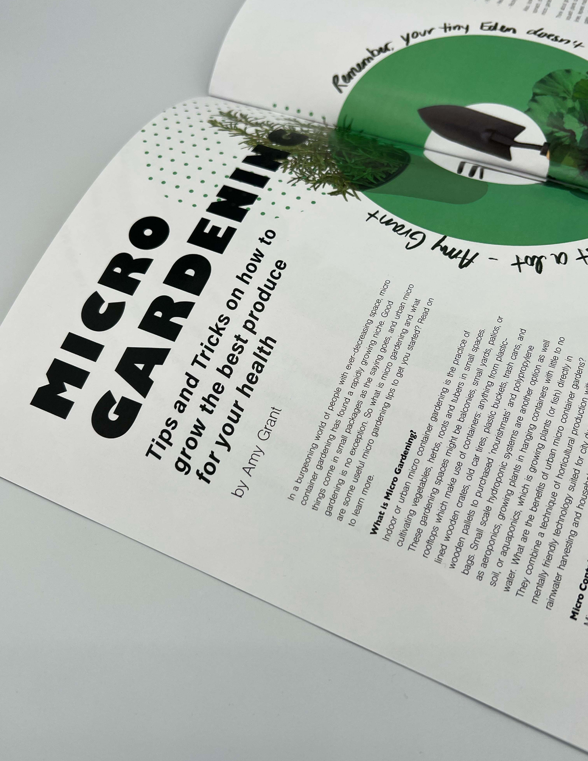 To begin the design process, I developed the concept for my magazine and created a logo matrix of 14 potential logos to be used as the masthead for my magazine cover. I then created several drafts for the front and back cover, the table of contents and the interior masthead. I conducted type experiments to discover typographic combinations that would fit my magazine's aesthetics. Finally, I used my collection of photographs of found plants, gardens, and fitness enthusiasts to create the final interior spreads and prioritized type setting for a polished and clean final look.