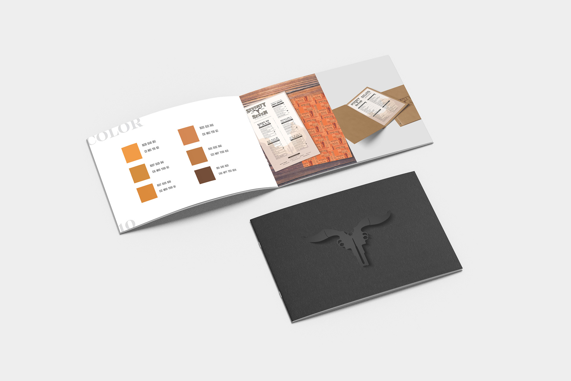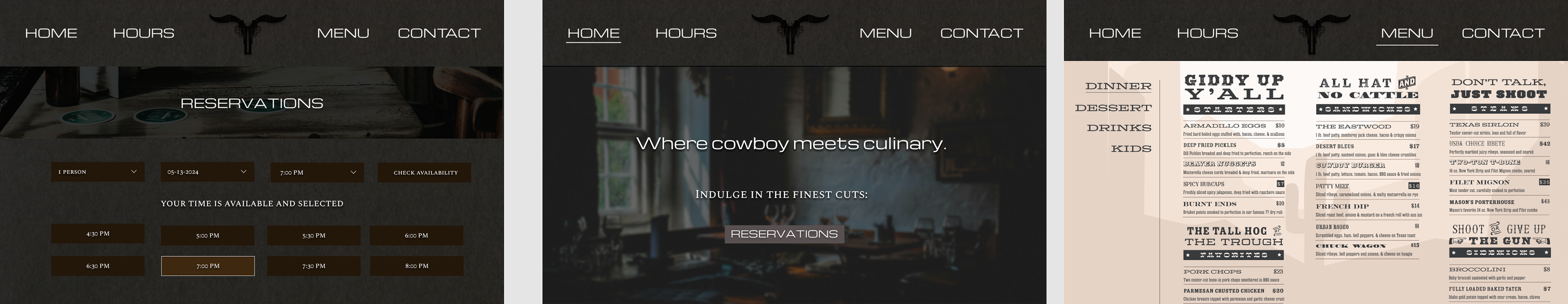 Matthew 18: 21-22 Biblical scripture about forgiveness. I curated a monochromatic color palette to reflect the colors often spotted in the western deserts of the US, and drew inspiration from western woodblock type posters to create the food and drink menus. I created the logo with two revolver pistols and bull horns to place a creative twist on the classic bull skull imagery often found in western culture, and I created the cowboy saloon imagery to reinforce the immersive western brand experience. I also designed the Website to reinforce the high-end steakhouse look and feel of the restaurant.