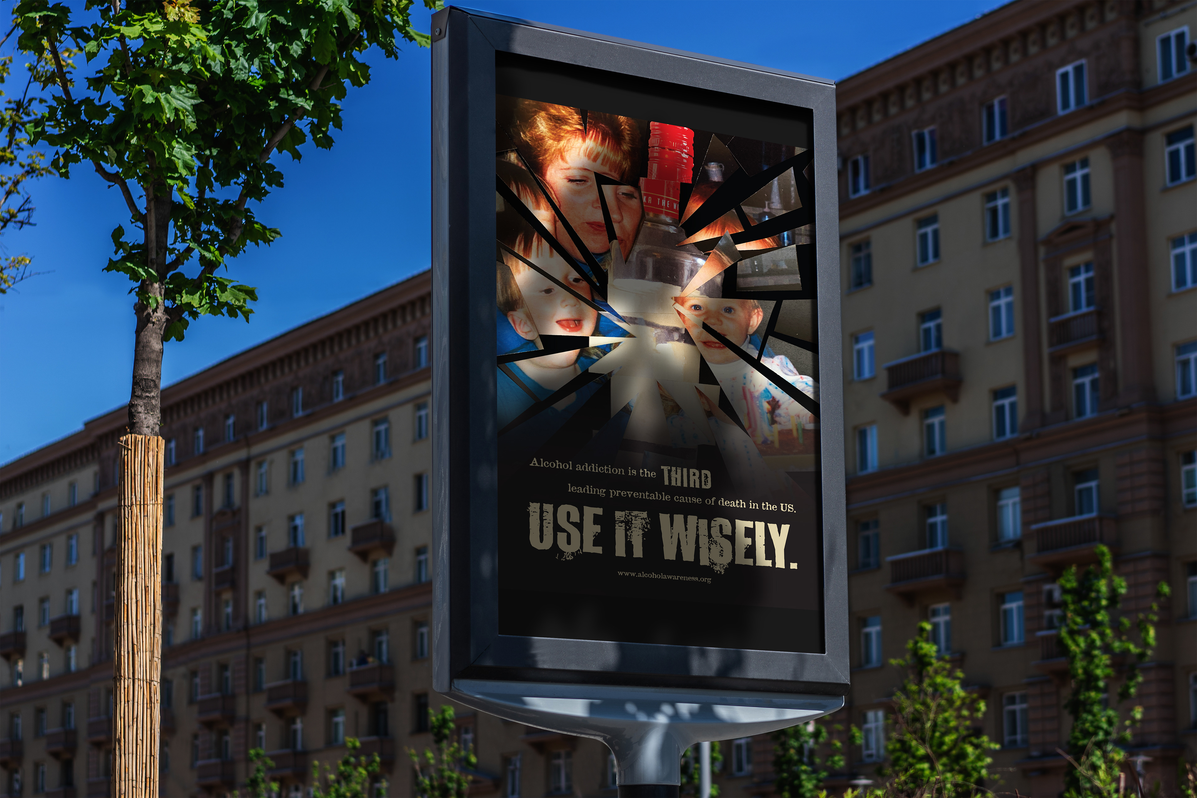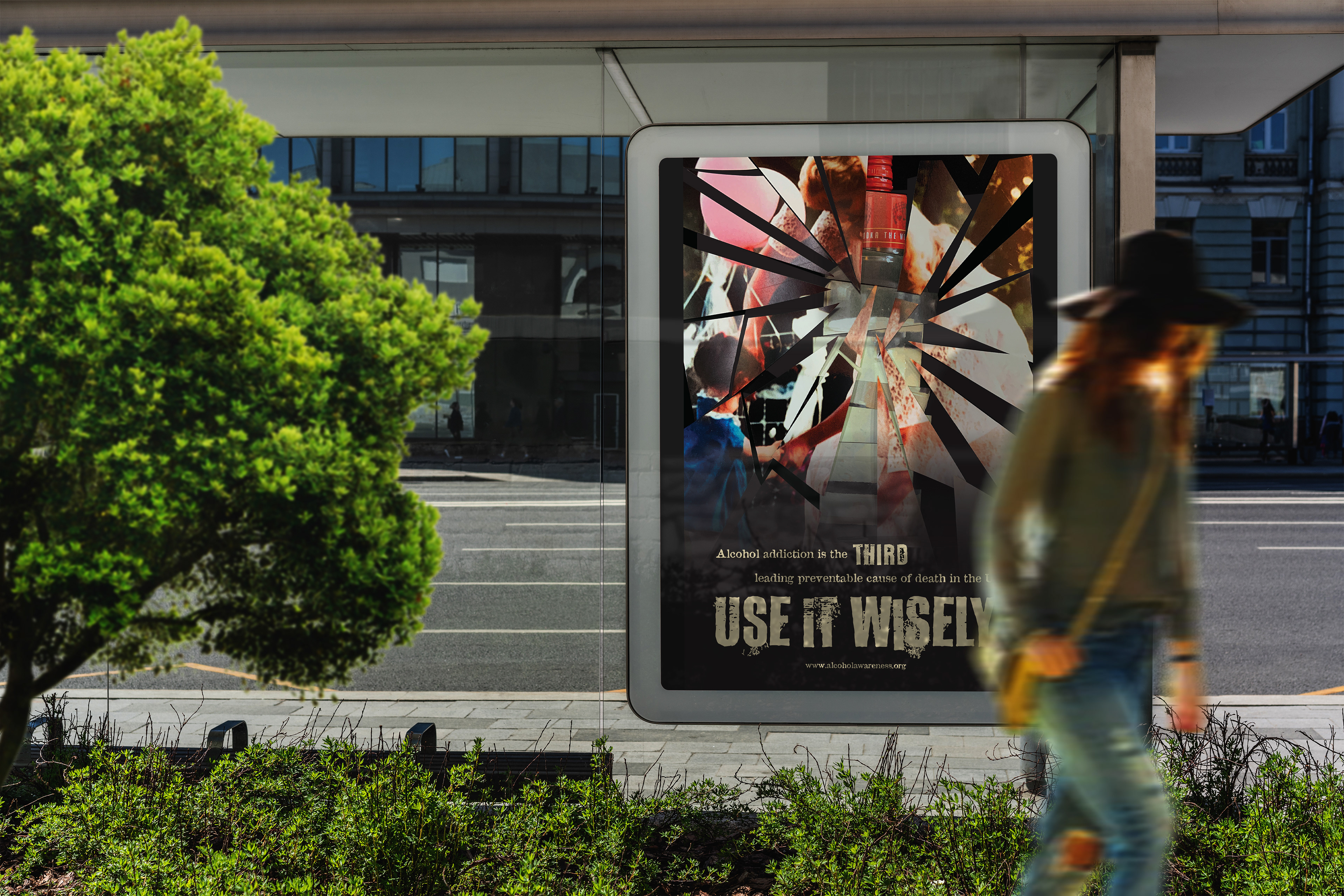 This social action poster series is designed to highlight the social issue of alcohol addiction. Utilizing cut photographs to mimic broken glass, this series employs visually cohesive elements to bring awareness and resources to society to combat this social issue. I chose to use rough and textured typefaces to reinforce the gloomy nature and gravity of the subject, as well as quickly grabbing the attention of viewers. I also chose to keep the type to a minimum and allow the imagery to do a majority of the talking so the viewer can grasp the concept in 20 seconds or less. Together, these elements evoke an emotional response from the viewer to leave a lasting impact on their use of alcohol.