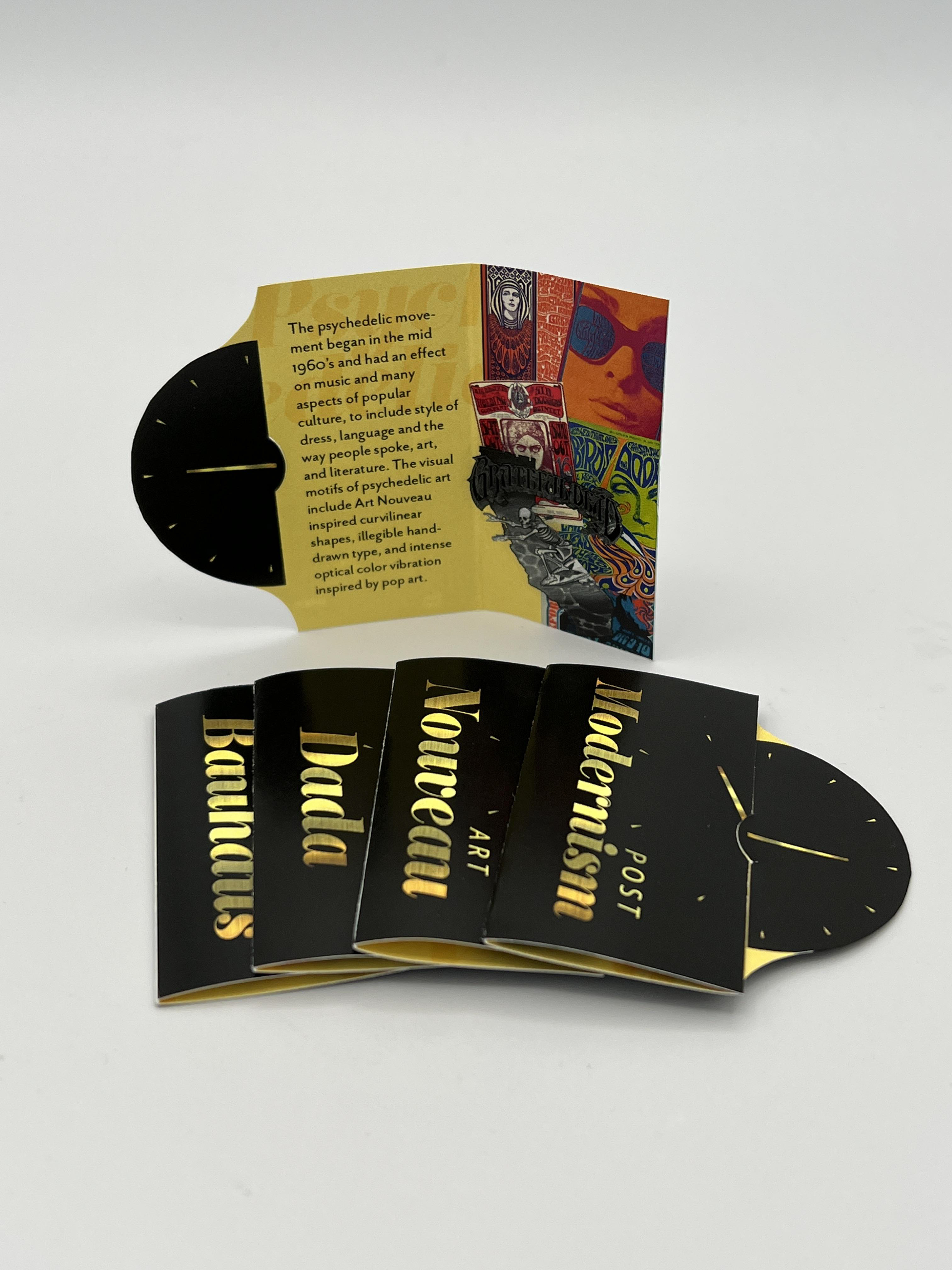My design process began with the creation of a mood board and sketching 4 concepts for the trading card designs, each concept including the designs for the 3 categories of the cards' content. In my concept work I found that I wanted to do a dye-cut edge to highlight the differentiation of the categories, and spent time exploring what I wanted each dye-cut edge to look like. I chose the color palette of black and gold because this combination is striking and dramatic, and is minimalist with respect to the colorful interior contents of each card. To push the boundaries of the traditional trading card, I decided that I wanted each card to open like a folder to reveal the inner content. I staggered the imagery included within each card to create the illusion of the artwork 'falling out' of the card when you open it, which includes some movement and action to each card as the viewer opens each of them.